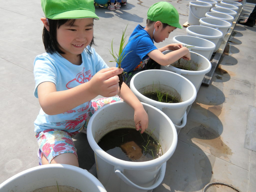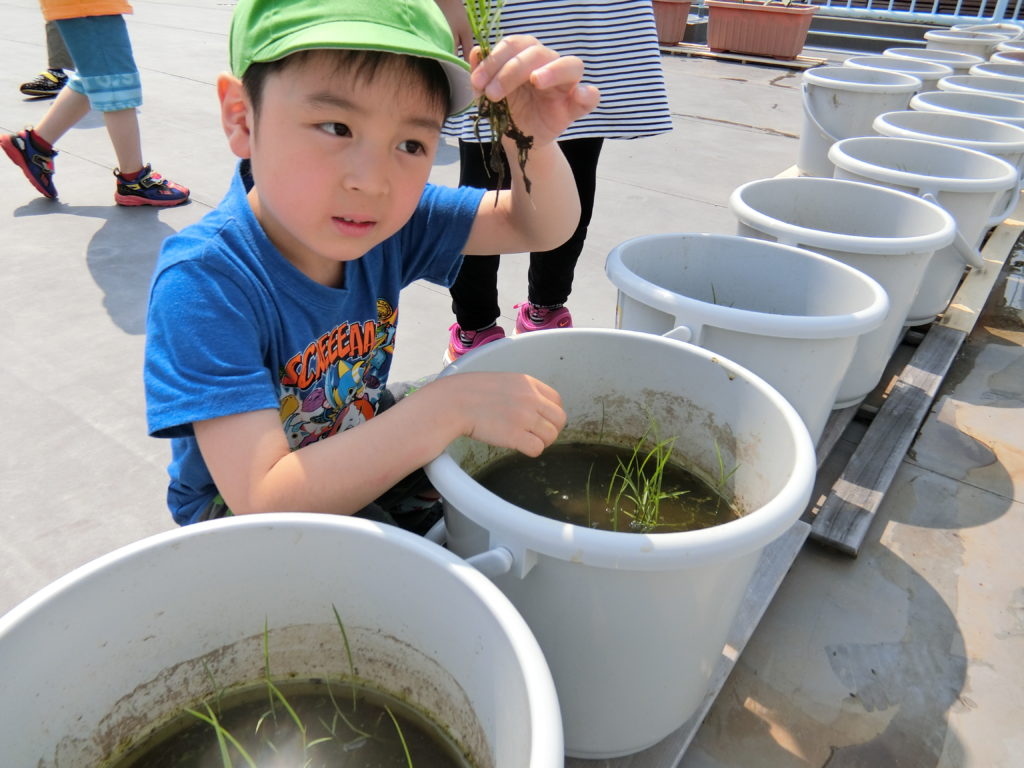 平成29年度5月31日(水) 今日は、苗の移しかえをしました! (狭いバケツの中でたくさんの稲を育ててもあまり大きくなりません。そこで、バケツの中の苗を、元気な苗4,5本にまとめ、中心に植えなおします。)