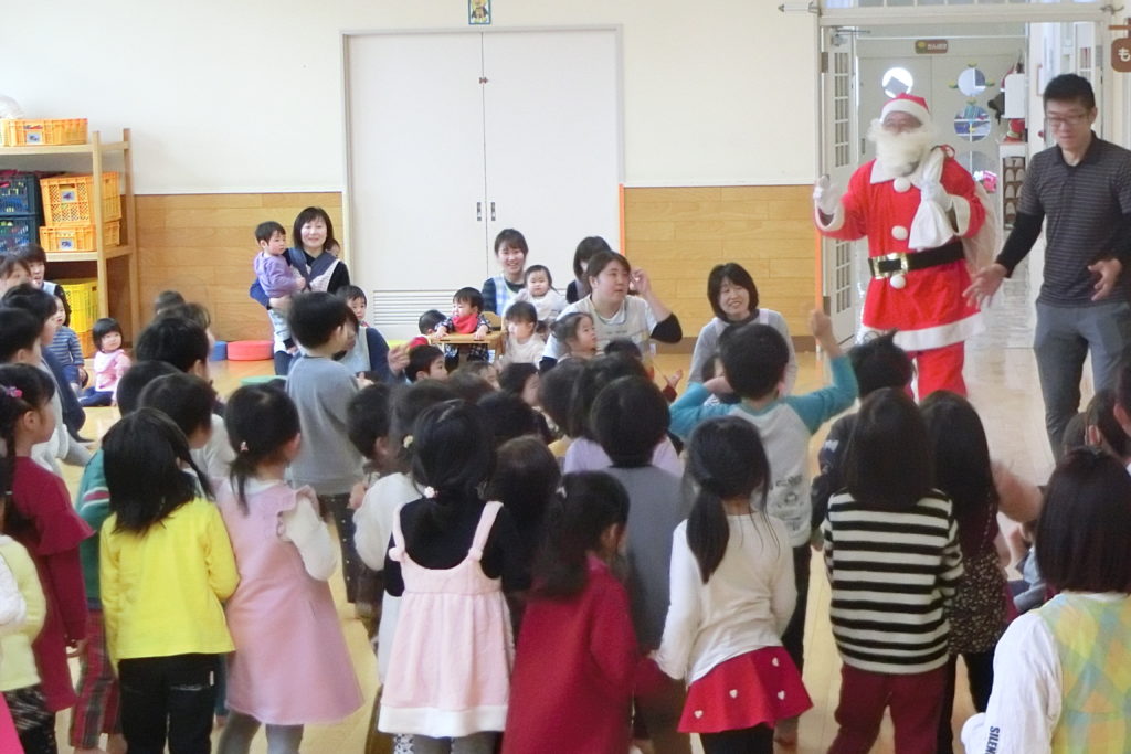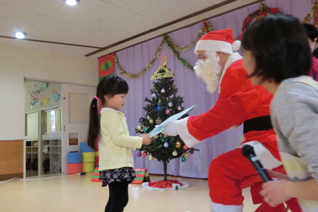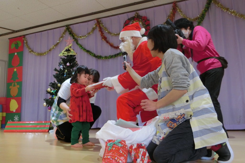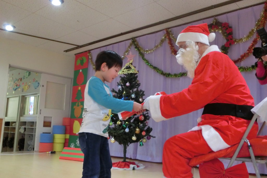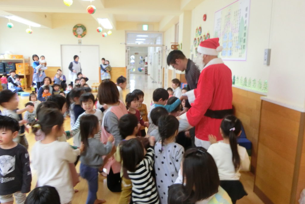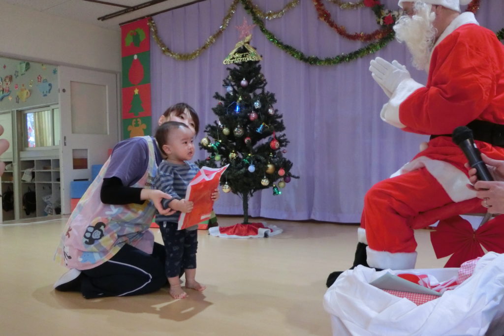 誕生会が終わったあとはサンタさんが登場!! 「サンタさんだ~!」と喜んでいる子どもたちです\(^o^)/ サンタさんからみんなへプレゼントタイム🎅💕 目の前のサンタさんに緊張しています(笑) さくら組さんはサンタさんに質問もしました! 😲「サンタさん、どこから来たの?」 🎅「フィンランドから来たんだよ!」 サンタさんの優しい声にみんなにっこり😄 サンタさん来てくれてありがとう\(^o^)/
