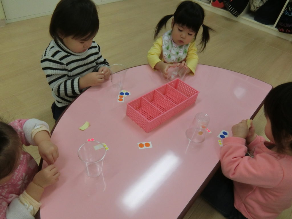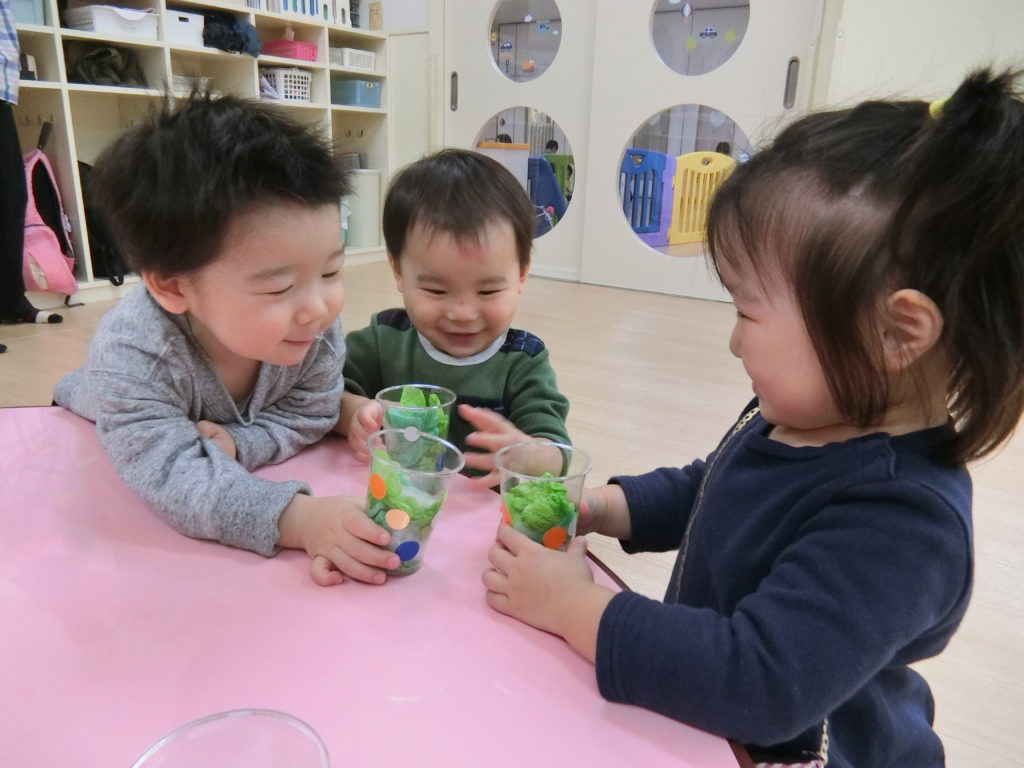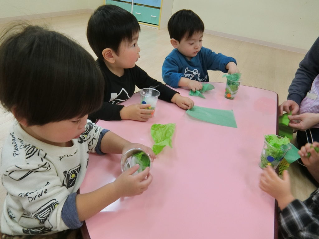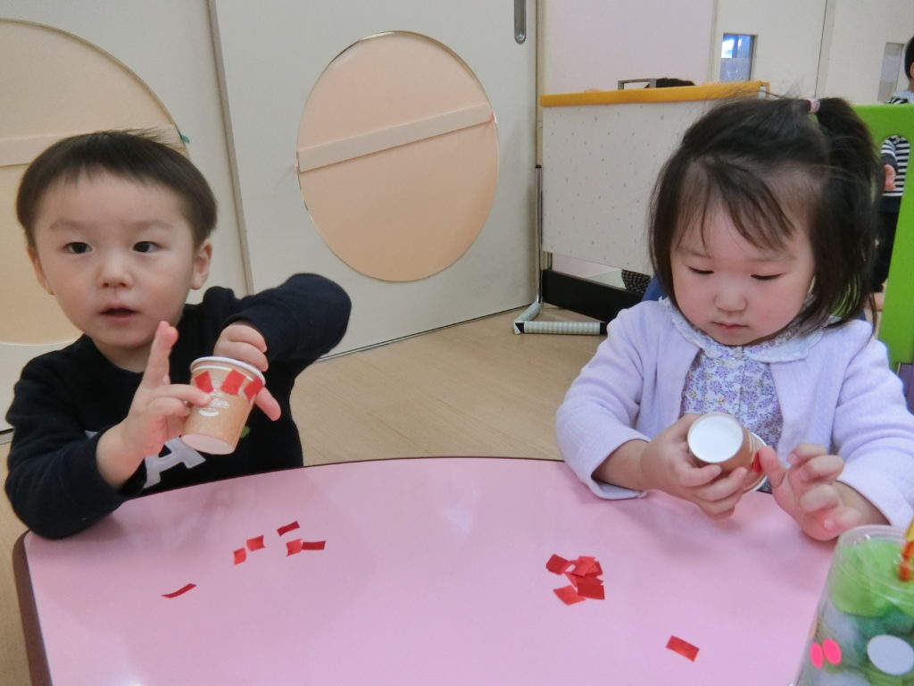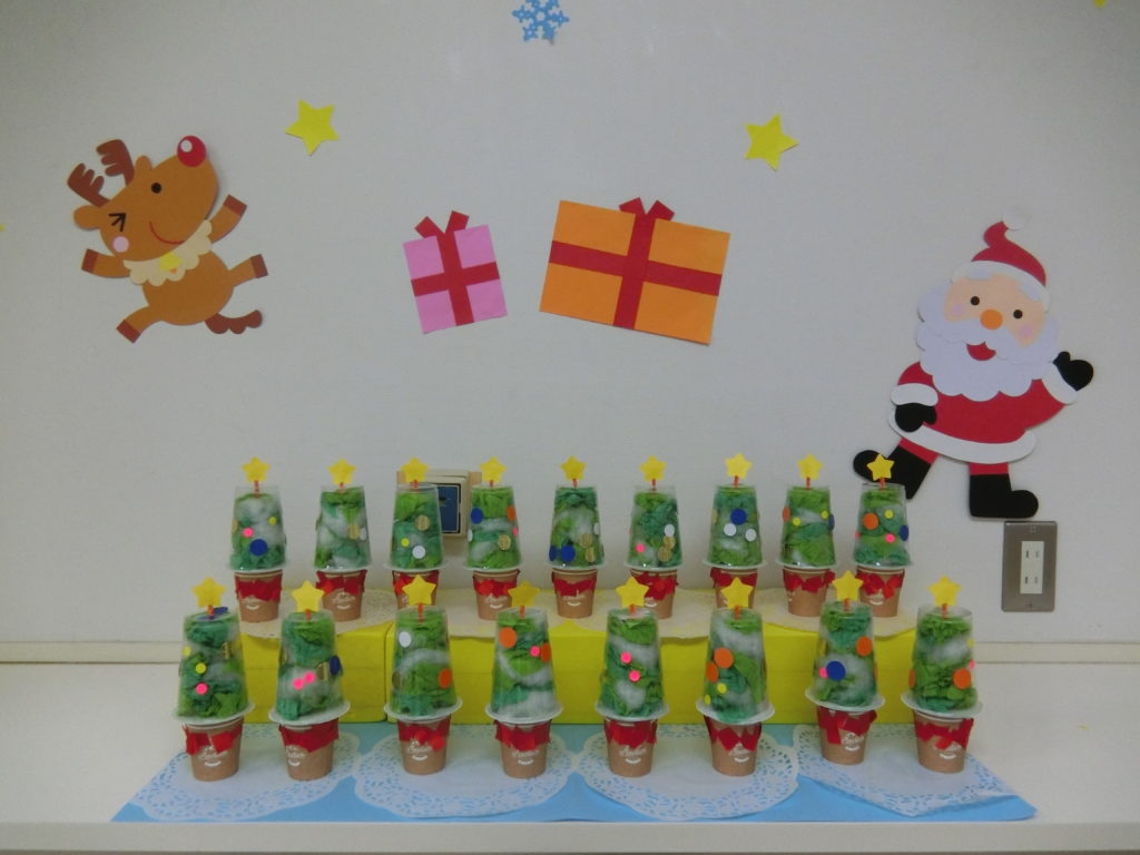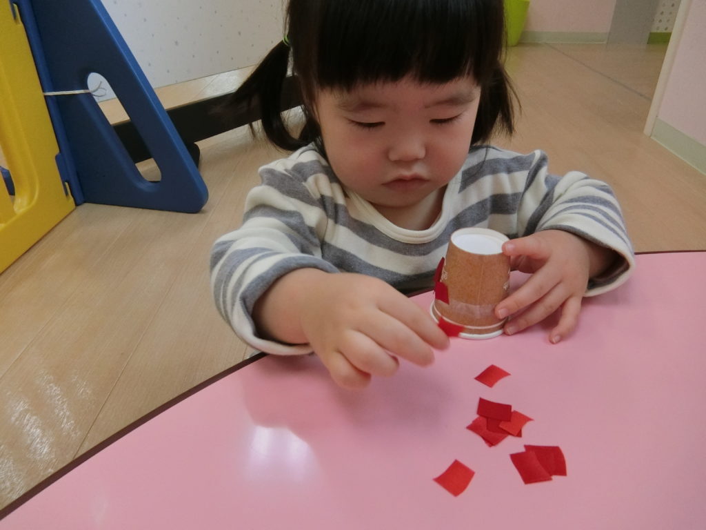 12月13日(金)クリスマスツリーを作りました(^◇^) 以前のシール遊びでは、台紙からシールを剥がすことが難しくて「やって」と台紙を保育士に差し出す子もいました。色々なことに興味を持ったり、自分でやってみようとすることが増えている子ども達。 今日も自分でやってみようとする姿がたくさん見られました✨✨ どんなクリスマスツリーが出来るのかな~ まずは、プラスチックのコップにシールをペタペタ!! 「どれにしようかな・・・」 指先が器用になってきて、台紙からシールを剥がすことが上手になってきています✨ 「みてみて!!」「できたよ‼」と保育士に見せてくれました(*^^*) シールを貼ったコップの中にお花紙と綿をつめて・・・ 「ぎゅ~‼」 「みてみて!」 「私の上手でしょ?」 「僕のも上手だよ😏」 見せ合いっこする姿にほっこりしました(*^-^*) 次は・・・ 茶色の紙コップに赤いリボンを貼りました。 とっても真剣ですね(>_<) どこに貼ろうか考え中かな? そして、子ども達一人一人の個性が詰まったクリスマスツリーが完成しました☆彡 サンタさ~ん‼かわいいクリスマスツリーを見に来てね~🎅🎅